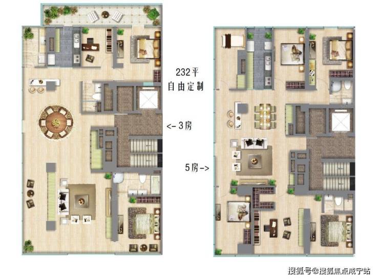 以232㎡面积产品为例,既可以做成3房也可以做成5房,全看用户灵活定制要求。追求简约艺术风格的话,你要做成大平层2房甚至1房也可以,留下空间来室内滑板或开卡丁车!