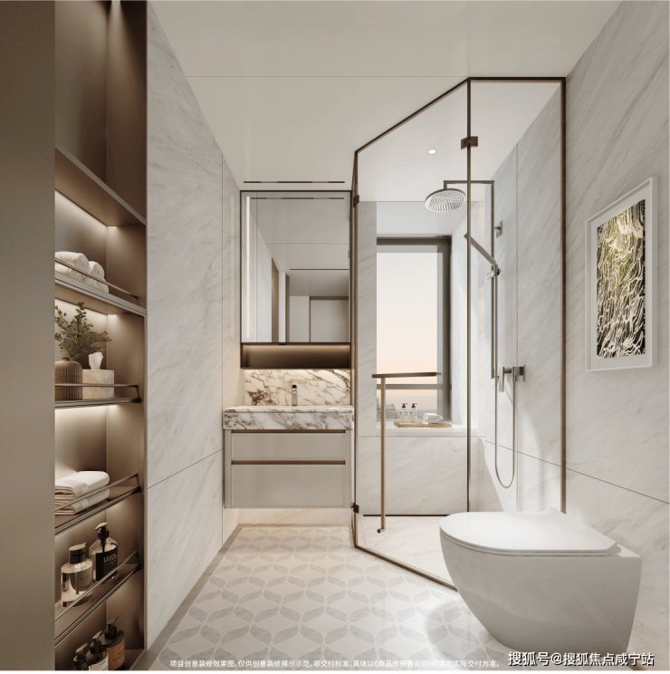 【卫浴系统】主卫恒温水阀搭配顶喷花洒,大理石防滑地砖与长条形地漏完美结合,公卫薄墙移门(不包括I户型)、淋浴区壁龛、一体式新风组合,主客卫双配智能马桶,静享高进阶卫浴系统时光。