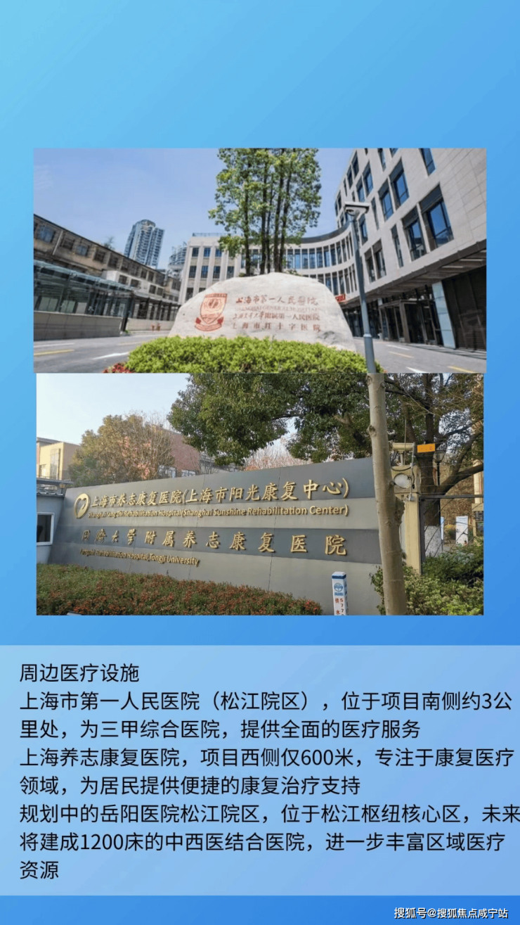 医疗:距上海市第一人民医院南院(三甲,松江区域内唯一三甲综合医院)2.8 公里,自驾 12 分钟;社区还将配备健康服务站,提供日常体检、慢病管理服务;