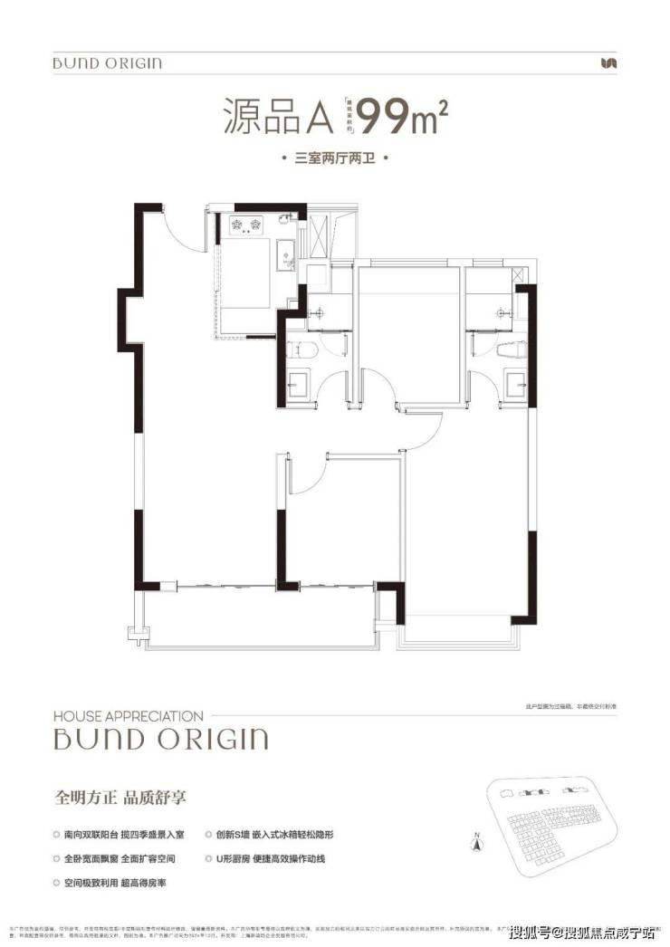 建面约99㎡3房2厅2卫,非常标准的动静分离、三开间朝南户型。