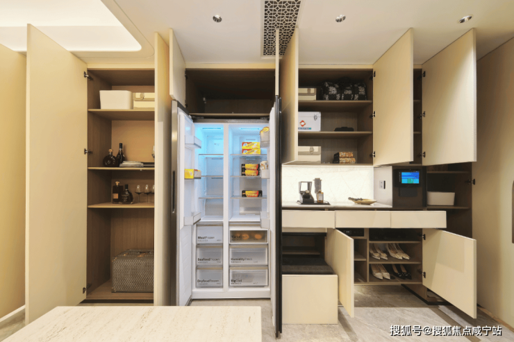 "分户s墙"设计在分户墙处增设“凹型空间",“冰箱外移"增加厨房操作台面和收纳空间,创造更合理的餐厨桌台动线。