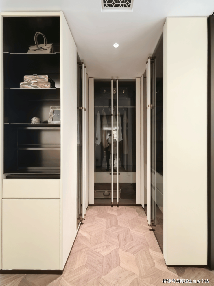 主卧和约99平户型一样,衣柜更大形成衣帽空间,还交付有半开放式、类似于酒店的迷你吧设计:
