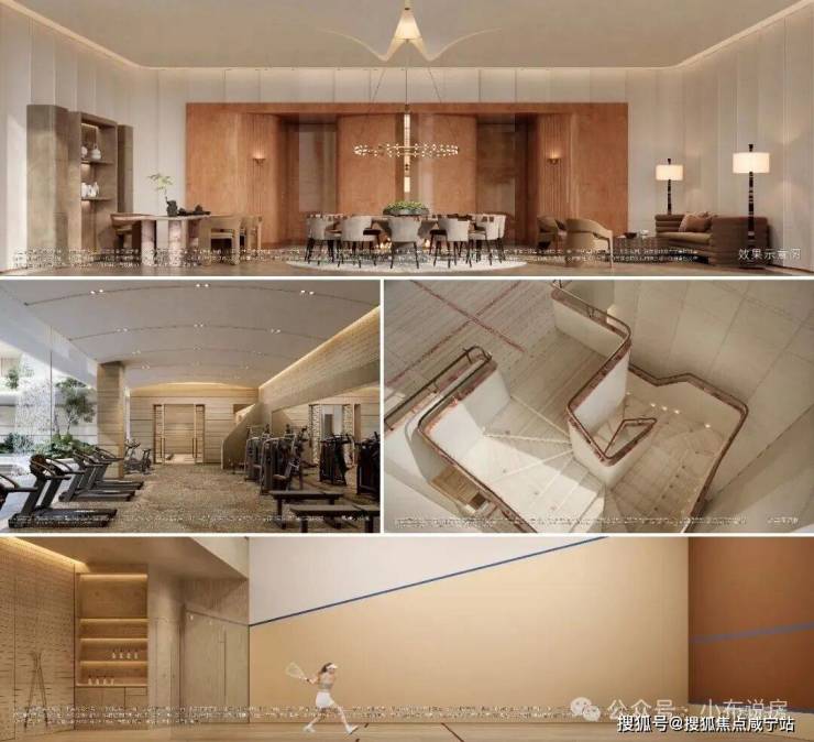 艺术旋转楼梯、地下光厅、区域首创国标壁球馆、飞瀑园景健身房、嵌入式景观书吧等,深度还原度假酒店质感