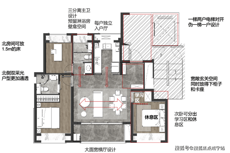 建面约90㎡的3室2厅2卫,一梯两户的设计,有着不低的得房率。
