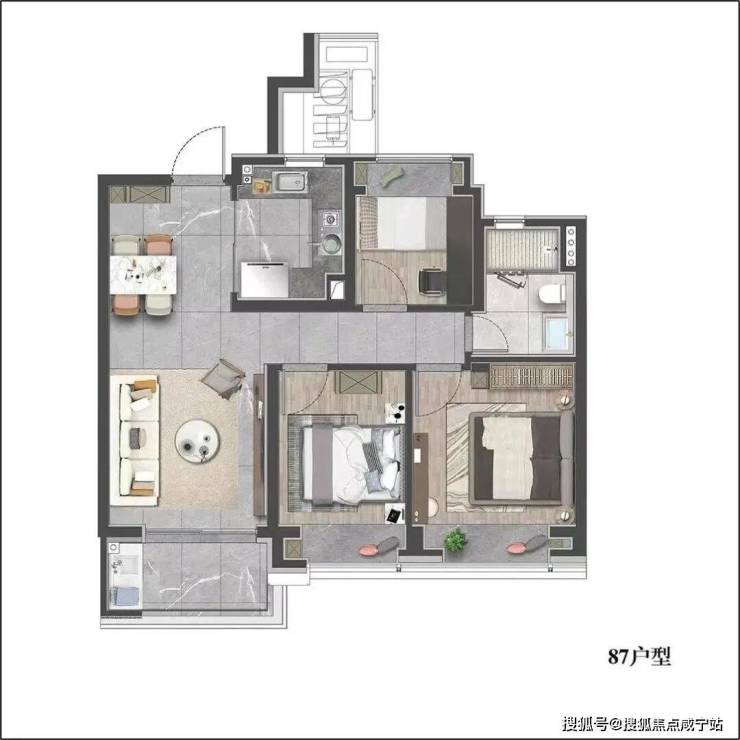 建面约87㎡3房,做到了三开间朝南设计,整个户型几乎没有浪费面积。实现空间节约、居住升级等美好体验。