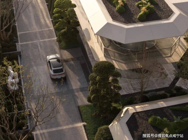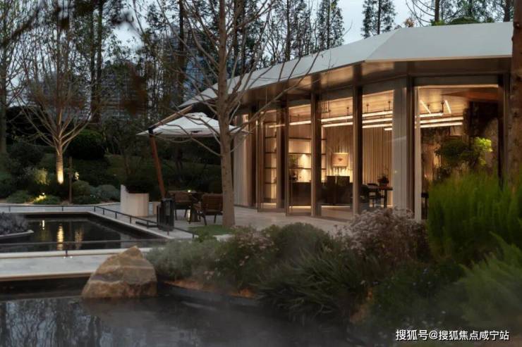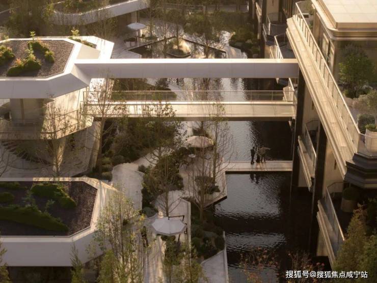 三层归家动线:从地面景观层到架空层,再到入户层,穿越绿植、光影与水景,步步进入私域。