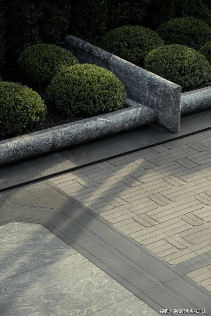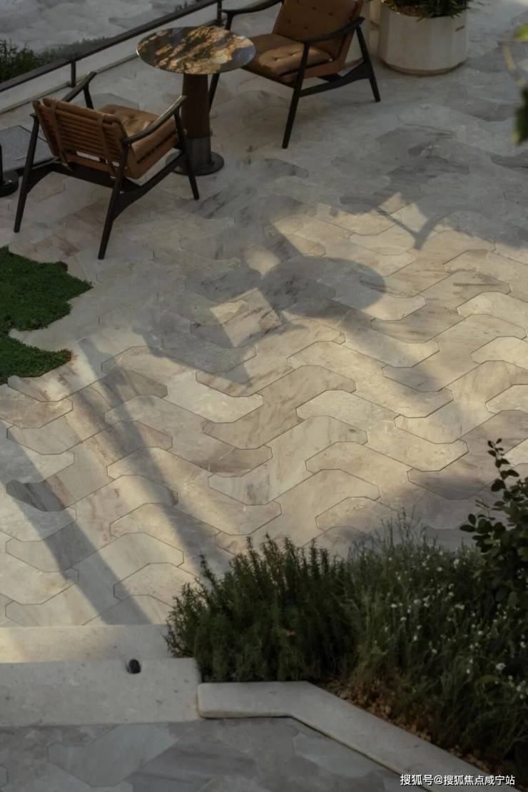 铺装延续柔和基调,米灰调石材温润而富有细腻变化,营造出高级的材质感受。图案上,景观转译了建筑的八边形语汇,通过现代手法将其咬合搭接,既延续了装饰艺术的基因,亦增添了一分时髦的未来气息。