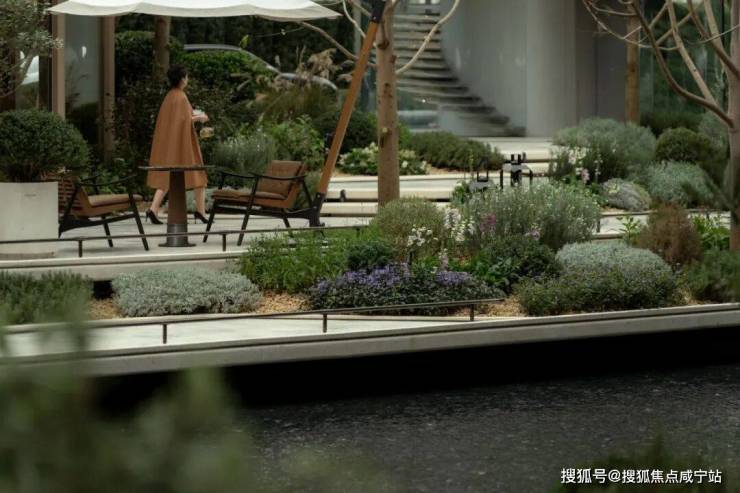 穿越核心水域,抵达光影水院的另一端,三座漂浮的花台映入眼帘。繁茂的花境簇拥着建筑盒子与邻水平台,构成花园主景。这里名为“弗珞拉”——取意自花神Flora,是一座临水而憩、充满惬意氛围的午茶花园。
