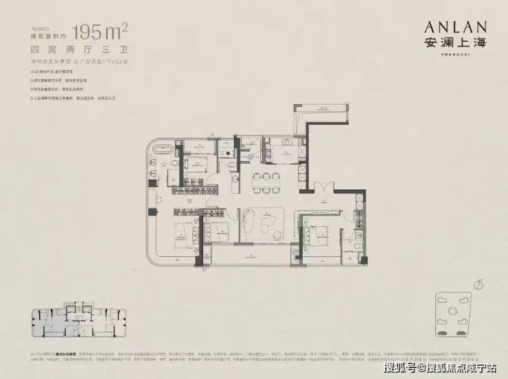 大面宽舒适195㎡户型:约40㎡大方厅, 环幕总面宽约39米,采光面远超普通住宅·。约88%高实得率,含私享电梯厅。南北通主卧+双主卧套房设计。