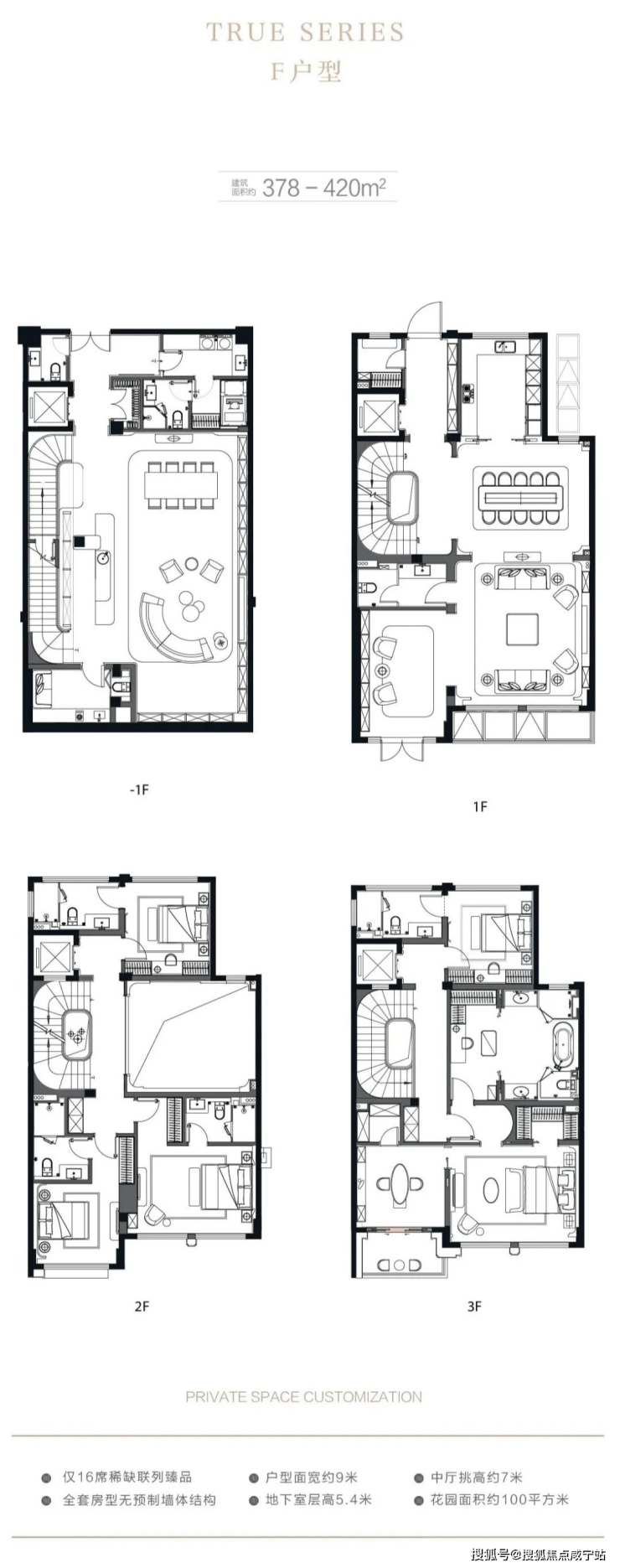 在售户型:建面约310-410平米,地上三层地下一层