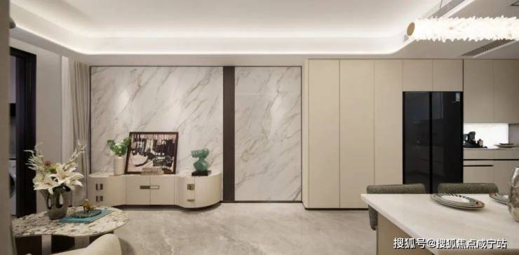 另外,入户玄关处的开放格背板采用罕见的白冰玉石材利用人造光源,通过石材的反射和折射,纹理清晰分明。