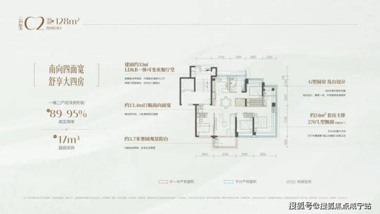 约128㎡「越级洋房」四室两厅两卫,实现了约89-95%的高实得率,将同等面积段产品的空间利用率推至新高度,做到真正的大四卧格局。