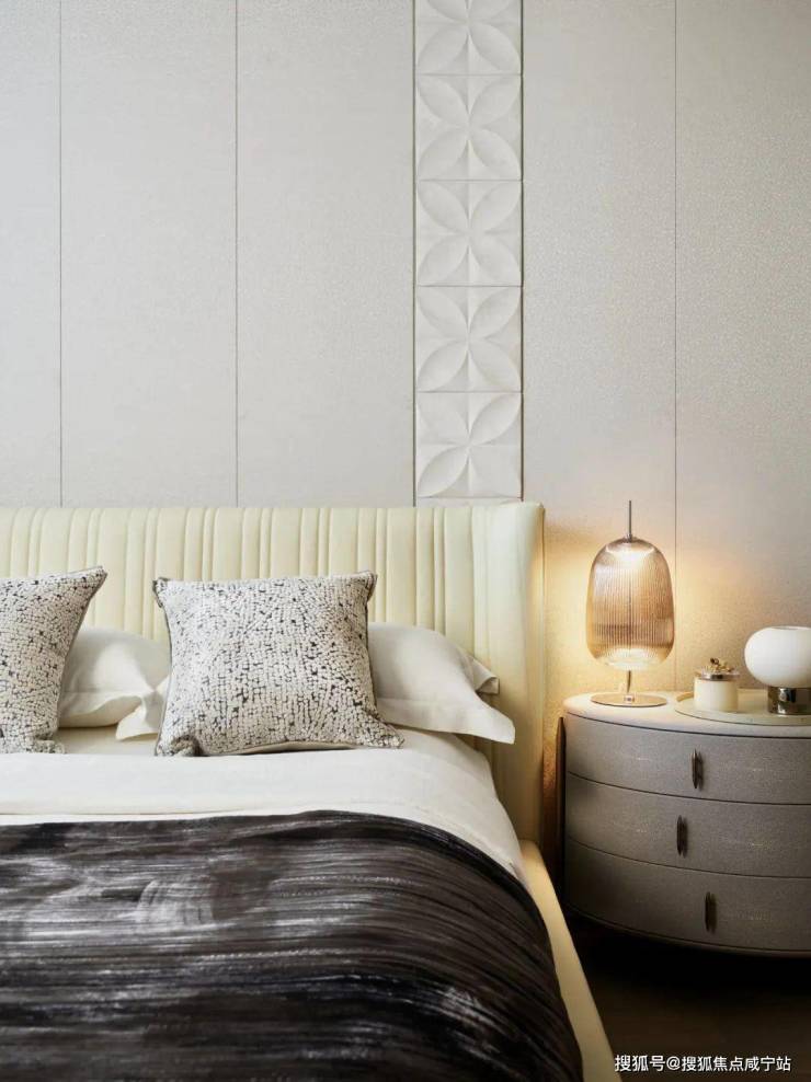 回看住宅楼栋,流动的立面与波光粼粼相互呼应,曲线模仿“飘带”线条,进口浅色花岗岩,结合金属铝板包边,形成“金镶玉"的高级质感。