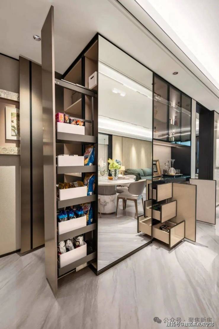 125㎡户型仅仅在客厅公区,就打造了三处整面墙的柜子来做收纳,除了传统的收纳柜,还有隐藏推拉零食架、内嵌式吧台等创新收纳方案,从衣服鞋帽,到大件行李箱再到家用清洁工具,都有专属的安置空间。