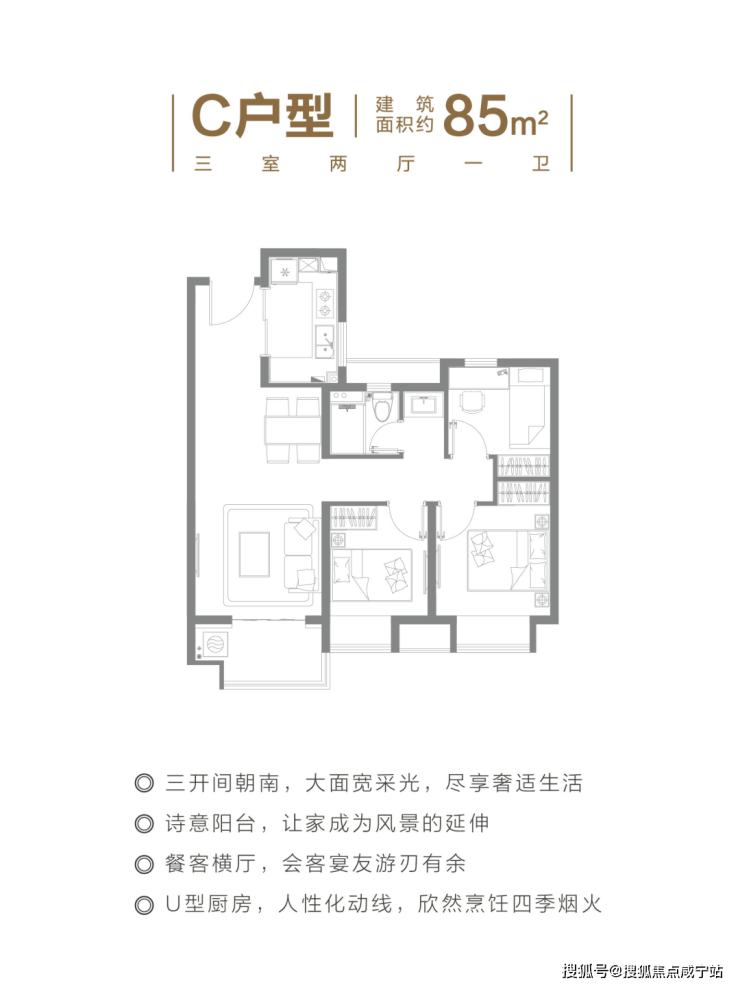 建面约85㎡的3房2厅1卫,低总价强功能三房,三开间朝南+整体动静分离的设计,都保证了这个户型的居住舒适度。
