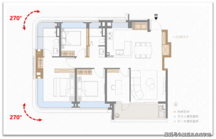 第三处山墙s墙的技术含量更高,直接让户型拥有两个大转角飘窗(主卧+主卫均双270°弧形转角飘窗)。凹处填放一个衣柜,视觉效果舒适,业主第一眼无知无觉,殊不知背后大有玄妙。