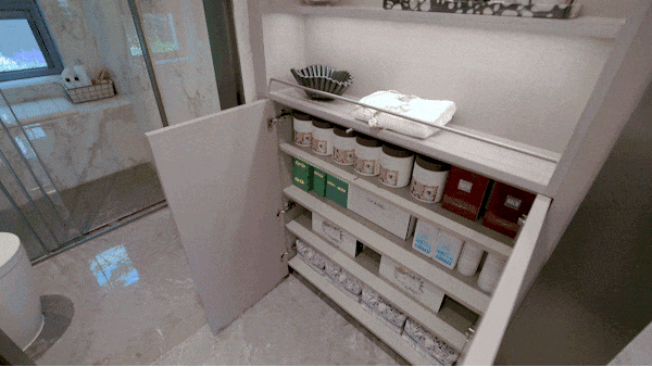 第二处卫浴s墙,大概一掌深,但是立面面积足足多了2平方米!超薄柜收纳有多强?一打开所有的东西琳琅满目,整整齐齐。而且另一侧的凹位也能得到很好的利用。