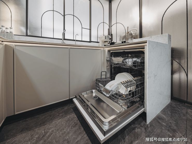 比如厨房的一圈橱柜都是飘窗,水槽也是。这样还能多出一个岛台空间,做饭的时候能和家人交流,象屿天宸雅颂,打造更有交流感的餐厨区域。