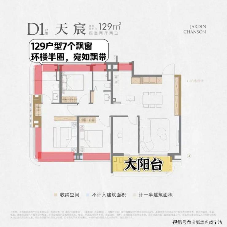 约107㎡边户全屋设计了5个飘窗,而139㎡户型的飘窗总体线长约23m,还不算阳台。飘窗面积折合下来,就是约15平米的赠送面积,价值小100万!
