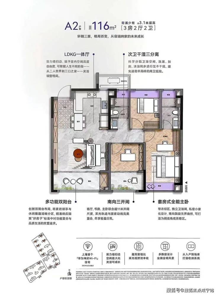 建面约116㎡3房2卫动静分离的户型,几乎是这个市场上最好的户型。
