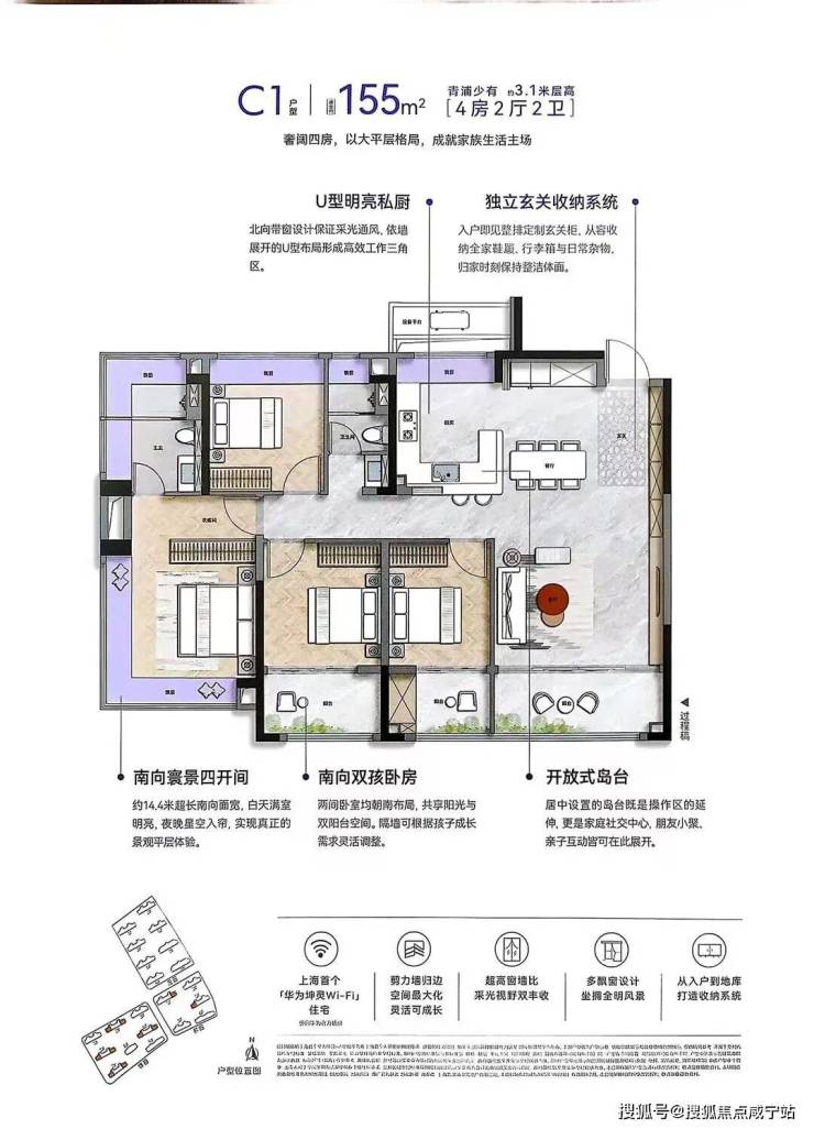 建面约155㎡的顶奢4房产品,四开间朝南,三间卧室全朝南。并且两间南次卧的尺度感可都是主卧级的。加上宽奢的客餐厅+阳台空间,这是真正一步到位的终极改善产品。