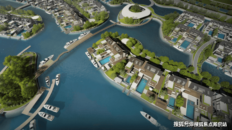 每一排别墅前都有一条渠道,引入水系,每户都带有水岸码头,用来停靠游艇,并且水系的分布确保每家都能开游艇到兰香湖中心,周末逛街shaopping,下了游艇到家再游个泳,不用出国就能享受棕榈岛同款生活。