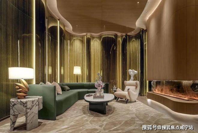 客厅空间采用大量造价昂贵的弧面设计,带来更有格调的审美价值: