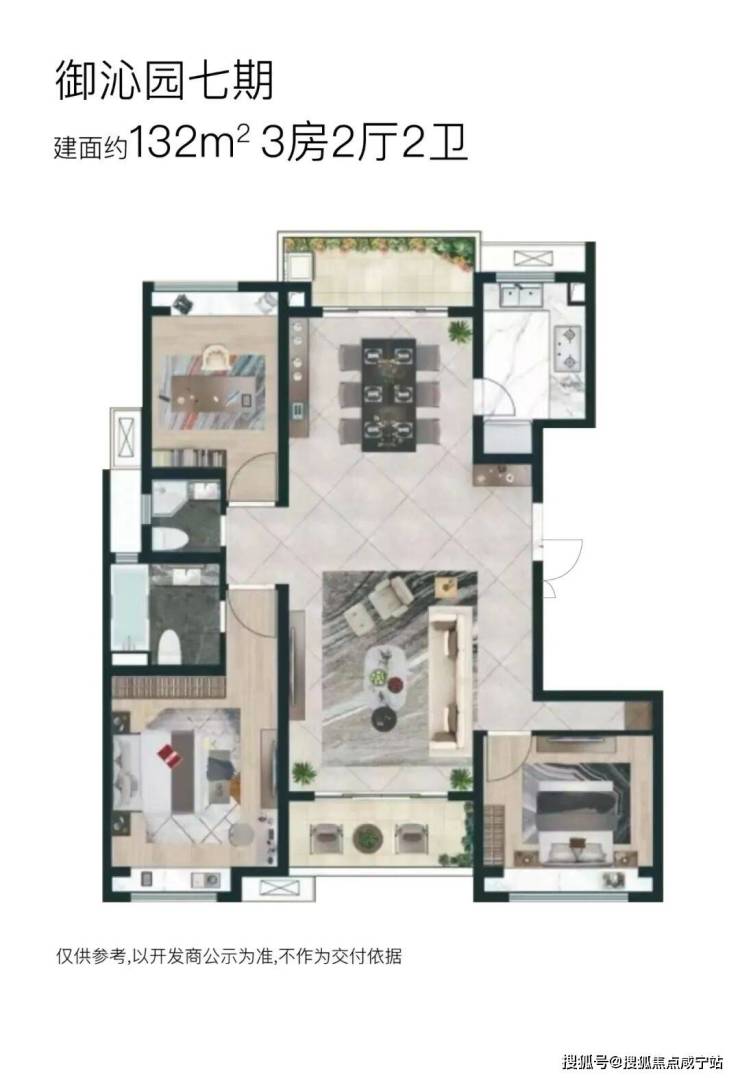 【御沁园】七期将推出3栋18F高层住宅,两梯两户无连廊设计;将推建面约132~172㎡三房户型,其中: