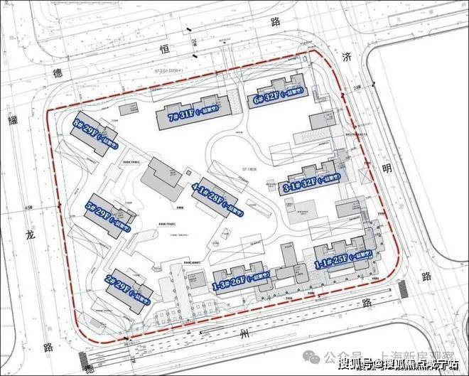 根据项目规划设计方案,项目拟建9栋25-32层高层住宅。全部楼栋均采用一层架空设计。项目采用完全式人车分流设计,人行主出入口位于德州路,三个车行出入口分别位于位济明路、德州路和德恒路。