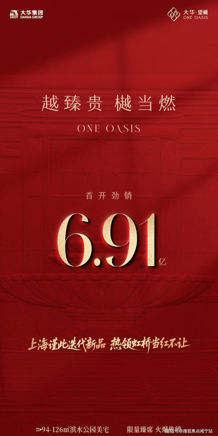 1月25日,全上海聚焦大虹桥,由华集团匠心打造的徐泾封面作品——大华·望樾于万众瞩目下盛大首开。项目凭借自身优质的产品力与创新力,首批次建筑面积约94-126㎡滨水公园美宅, 当日成交金额突破 6.91亿元 大关,强势领跑区域市场!