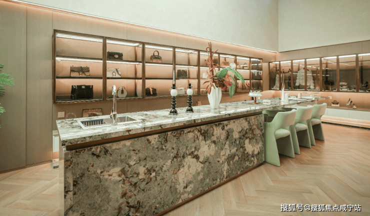 女士主题空间,则是专属的休闲角落。陈列柜展示着心爱的饰品和新款箱包,每处细节都透露着女主人的审美品位。落座区挑高设计,作为主人的私人会客厅,尽显奢华阔绰。
