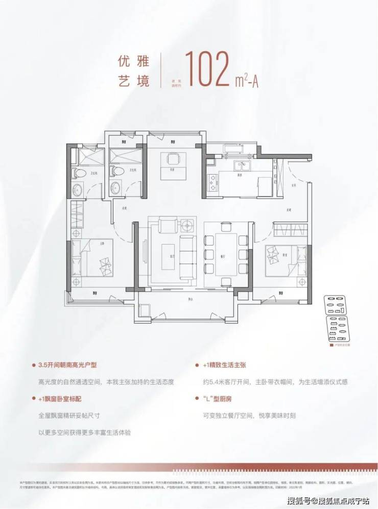 102㎡三房两厅两卫的舒适户型,约5.4m横厅设计,3.5开间朝南,得房率约80%左右(*该得房率仅供参考,最终以开发商官方数据为准);每间房均有飘窗,全屋飘窗共享有额外的面积约13㎡(*此处面积仅供参考,最终以开发商官方数据为准)在市场上也是少有的产品。