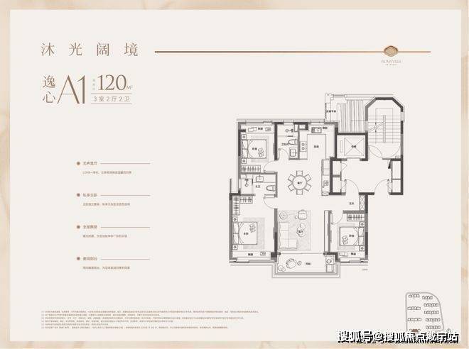 户型特点:边套户型,3开间朝南,方正格局。客餐厅一体化设计,餐厅空间宽敞,客厅进深较短但可通过与阳台连通优化空间感。全屋飘窗设计,边套南北卧室为270°转角飘窗,采光充足。独立电梯厅约7-8㎡,可改造为玄关或收纳空间。