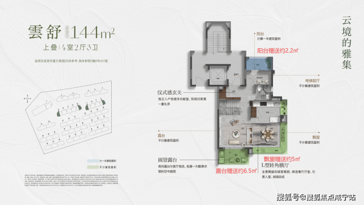 约144㎡上叠,入户独立梯厅,带来更好的功能利用和私密性。