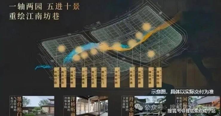 【园林】园林设计上依据“一轴两园 五进十景”规划,以豫园造景手法为基础,提取楼阁、折桥、墨池等中式元素,构建立体山水,重绘江南坊巷。