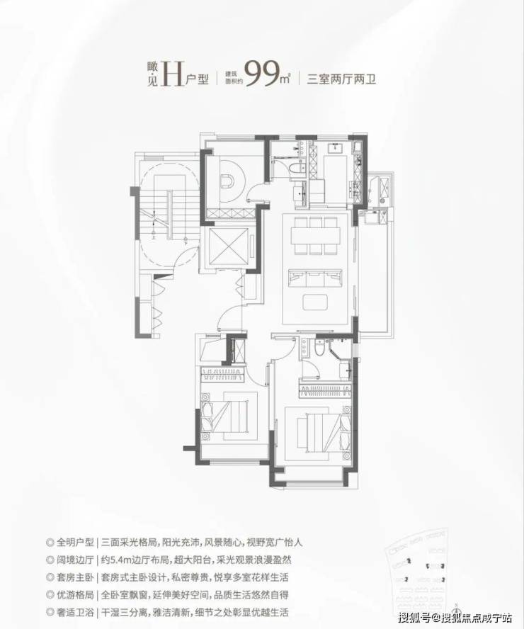 ②建面约99㎡H户型:三面采光,全能景观王炸边厅户型!