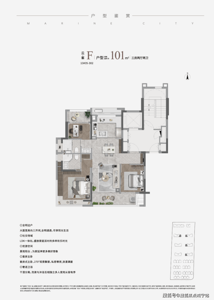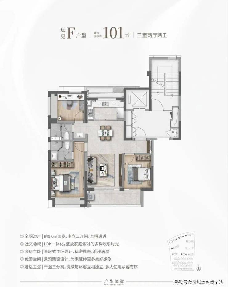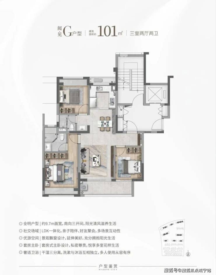 建面约101㎡户型,做到了3房一步到位,购房者也无需更多纠结,同时还可获得更统一的圈层;