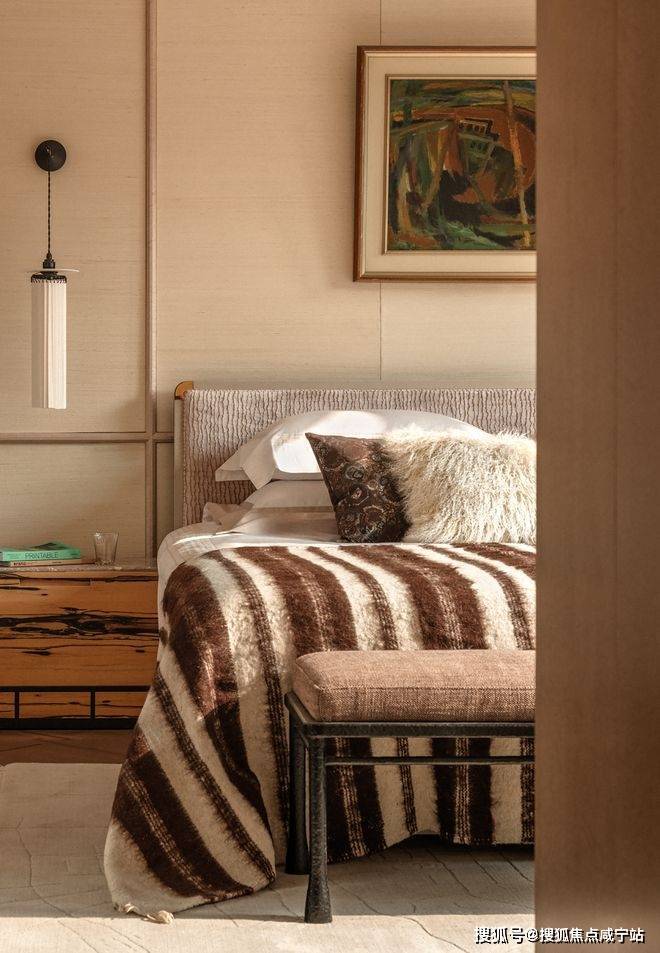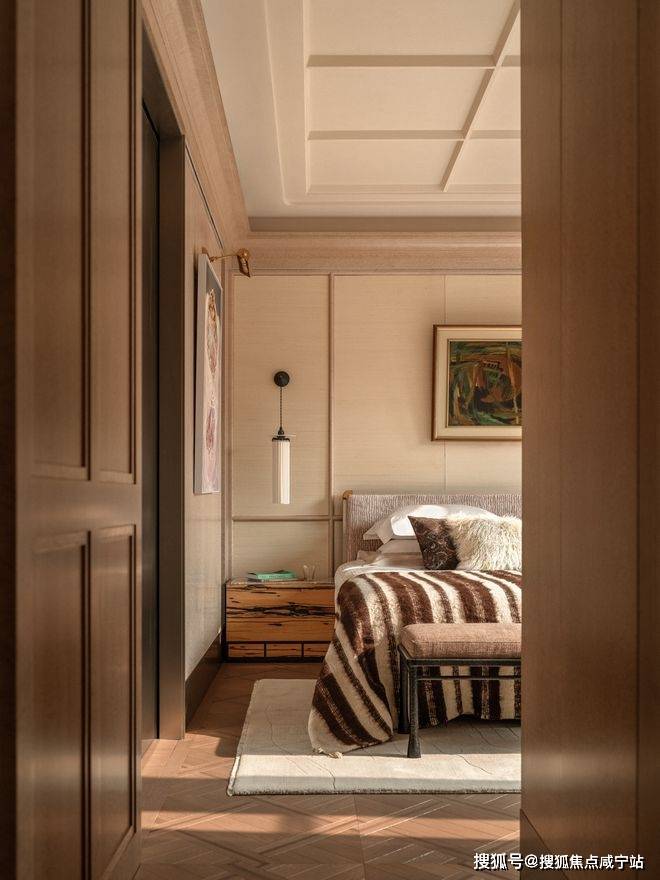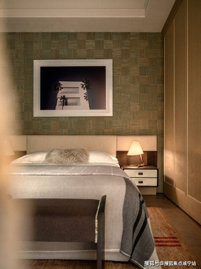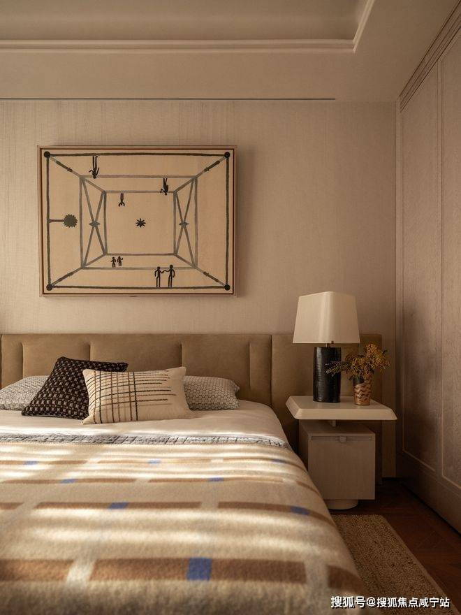 主卧床屏后结合屏风与窄床背,以对称形式建立空间的秩序骨架。