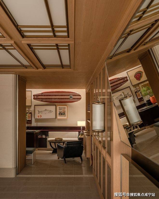 整体布局采用向心式的“打开”策略,会客区使用木地板拼花,私宴区则使用更符合场景的石材拼花。