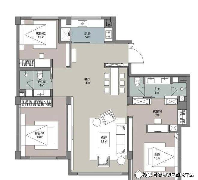 160㎡3房:双套房设计,客厅6.8米面宽,主卧带独立衣帽间,更适合三代同堂家庭。