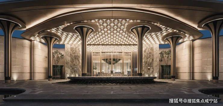 大门口的水景采用了龙鳞水纹的造型。在现场,会有种身处顶奢酒店入户大堂的观感。