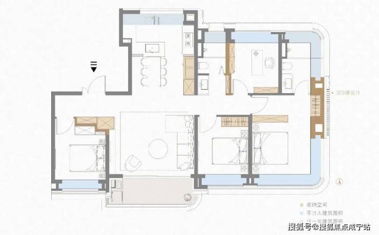 这个户型有独立电梯入户,保障私密性的同时,还多了一个独立都电梯厅,相当于多了一个小厅,可以用来规划摆放收纳柜,变相提高了“得房率”。