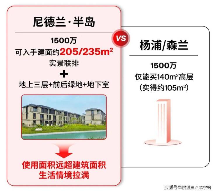 在杨浦/森兰,1500万仅能买140㎡高层(实得约105㎡);而在尼德兰·半岛可入手建面约205/235㎡实景联排,地上三层+前后绿地+地下室,使用面积远超建筑面积,生活情境拉满。