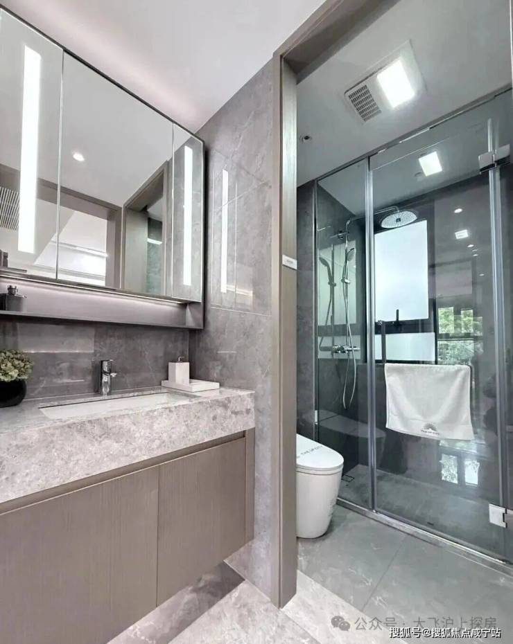 卫浴收纳系统:可抽拉龙头、收纳柜层板可变式设计、金属拉篮式设计、预置吹风机点位、270°镜、防雾镜、美颜灯等;