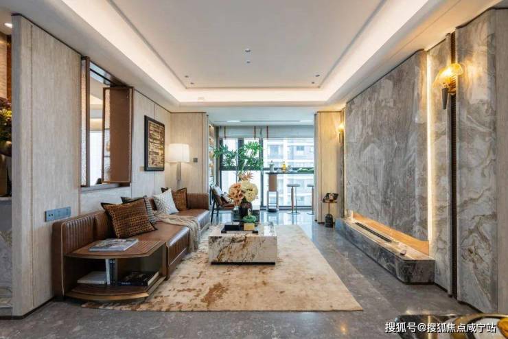 公区设计方面,该户型实际是南北动静分区的设计,南面主次卧休息区域,北面客厅联通餐厨区和水吧台,格局相当方正,避免了面积浪费,也让视野几无遮挡,进门就能感受到大宅气度。