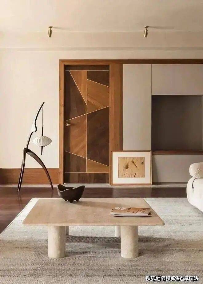 电视背景墙双色木纹板拼接做装饰。