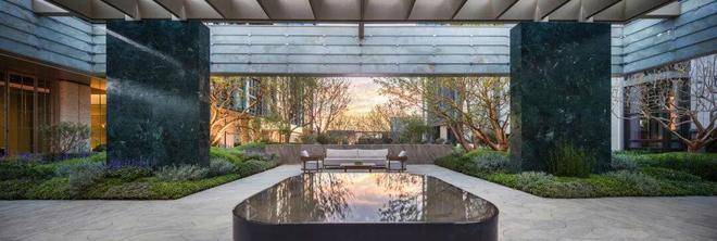 庭院中遍布着睡莲,从这里往出去像一幅画,高低层次的叠水景观,超大型的原石,还有私密的谈话空间,舒适惬意。