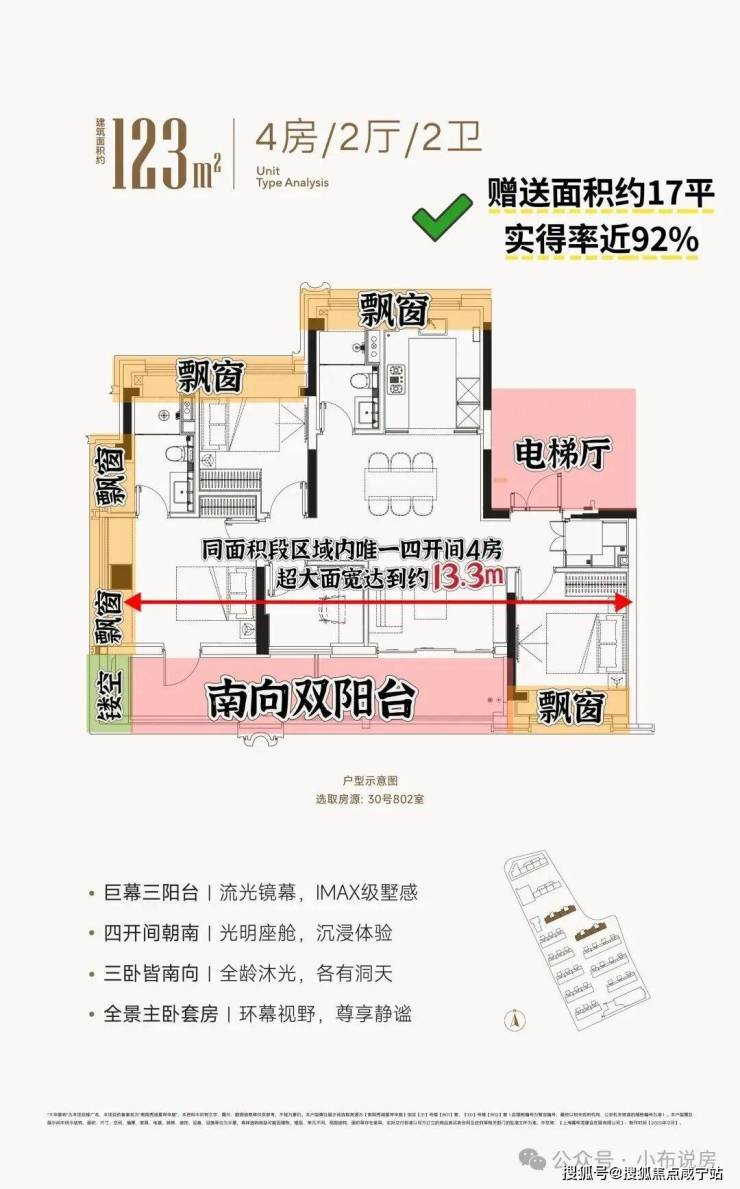 南向2个大阳台+飘窗附赠+电梯厅延伸空间,赠送面积约15m²,实得率约96%。