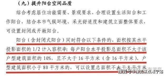 其次是阳台。9月份颁布的住宅新规中:要求阳台面积不大于建筑面积10%且封顶16平米,实施“比例+阈值”双控。
