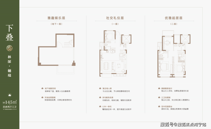 有更大尺度的改善需求,可以选择项目的叠墅产品, 主力产品建面约91-132㎡上叠,约113-132㎡中叠,约106-145㎡下叠。